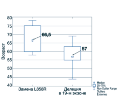 Средний возраст женщин с мутацией L858R недостоверно выше относительно женщин с делецией в 19-м экзоне, составляя 69,5 и 60,7 года соответственно (p=0,258). При анализе спектра мутаций генов EGFR в зависимости от возраста у обоих полов установлено, что мутация в 21-м экзоне с заменой лицина на аргинин L858R чаще всего наблюдалась в возрасте 60–75 лет, медиана при этом равна 66,5 года. В то же время делеция в 19-м экзоне выявлялась у более молодых лиц – 55–65 лет (медиана 57 лет). Однако различия между ними недостоверны (р=0,826); рис. 6.