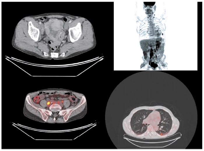 Fig. 1. Stage 4 bladder cancer with invasion and metastasis in obturator, common iliac, inferior mesenteric lymph nodes, and lungs.