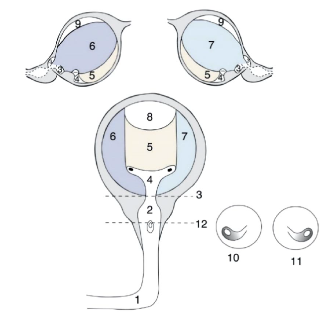 Note. 1 – anterior urethra; 2 – prostatic urethra; 3 – bladder neck; 4 – trigone; 5 – posterior wall; 6 – right wall; 7 – left wall; 8 – dome; 9 – anterior wall; 10 – right ureteral orifice; 11 – left ureteral orifice; 12 – vermontanum (men).