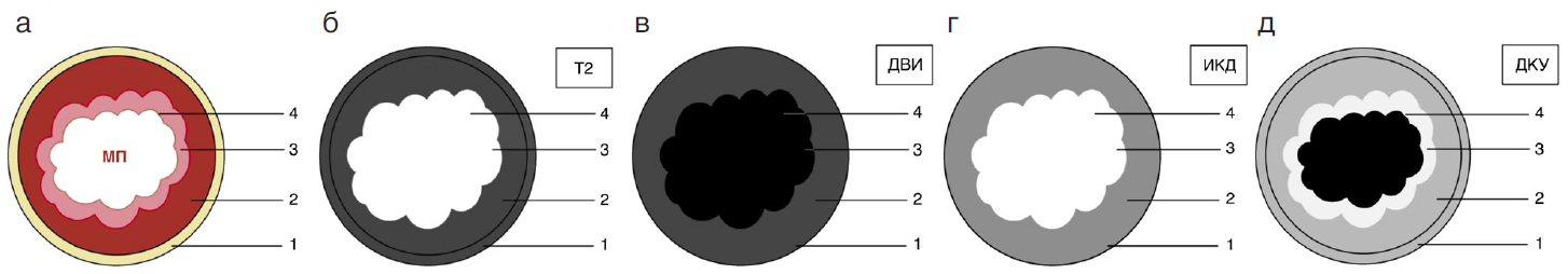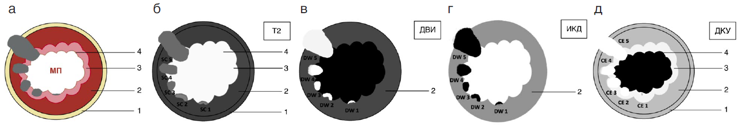 Рис. 3. Схематичные изображения оболочек МП: а – морфологическая схема; б – Т2-ВИ; в – ДВИ; г – ИКД; д – ДКУ.