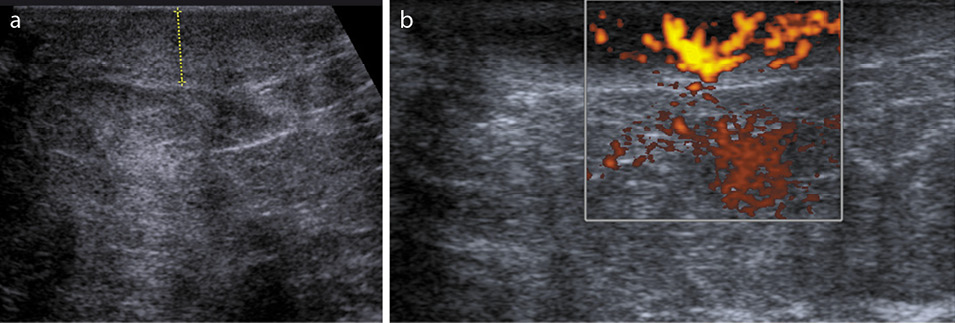 Среди всех методов визуализации в диагностике локального и диффузного отека кожи маммография характеризуется наиболее высокой эффективностью за счет возможности анализа симметричных зон «суммационного» изображения органа. При этом основным признаком отека кожи является ее утолщение (рис. 1). С помощью ультразвукового исследования молочных желез также возможно визуализировать отек кожи за счет утолщения и активного кровоснабжения кожного покрова (рис. 2). Но данный метод субъективен и обладает низкой результативностью в выявлении локального отека кожи. Роль магнитно-резонансной томографии молочных желез в решении этого вопроса незначительна (рис. 3), и поэтому этот вид визуализации не может использоваться для дифференциальной диагностики злокачественной и доброкачественной природы отека (уровень доказательности 1b, уровень рекомендаций A) [4].