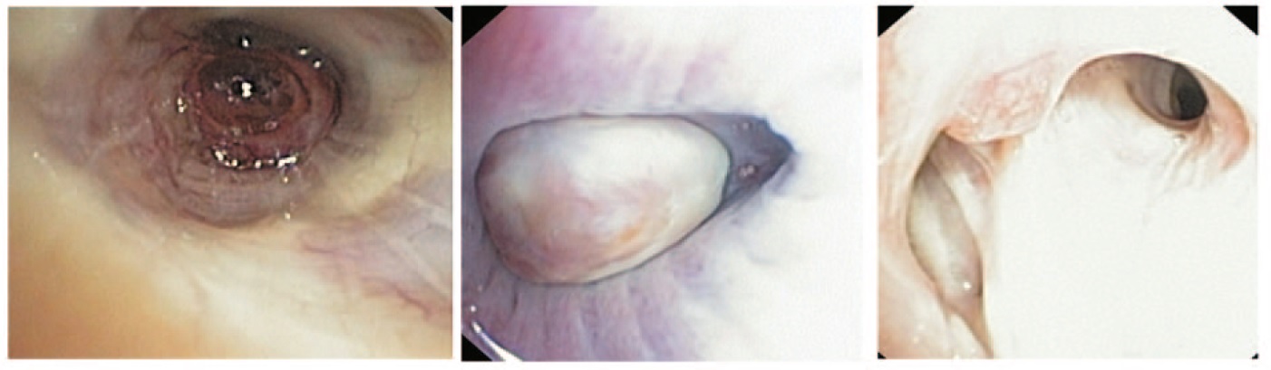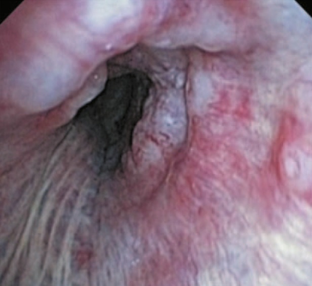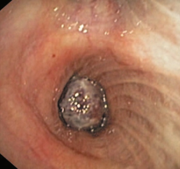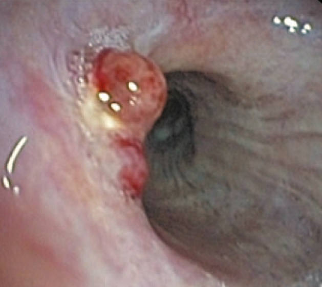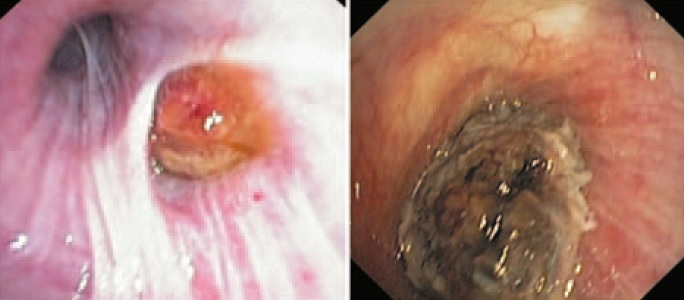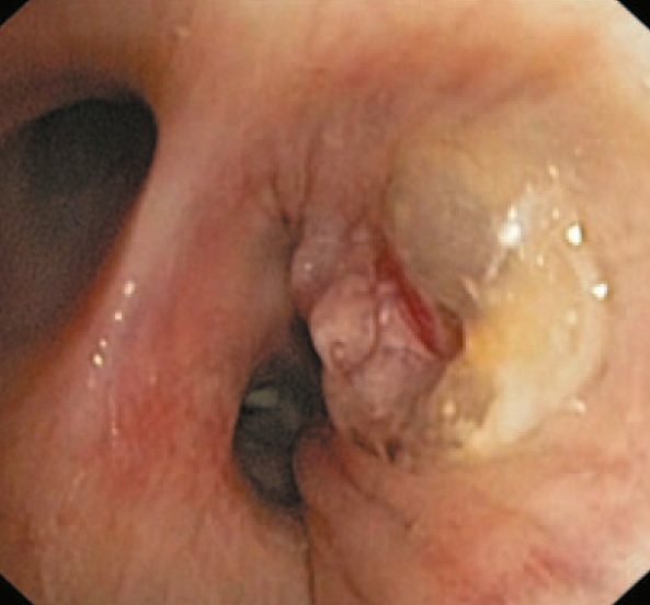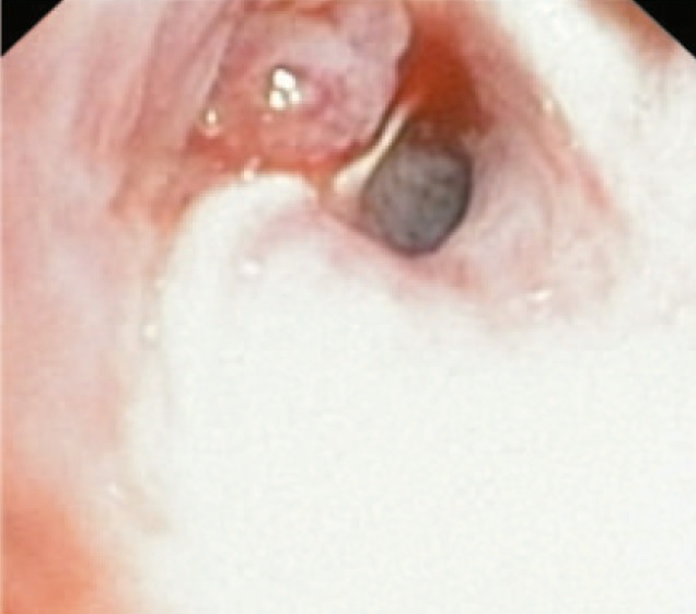 Для метастазов рака почки характерна экзофитная тромбоподобная или гроздьевидная опухоль вишнево-красного цвета или с синюшным оттенком, иногда покрытая слизеобразным налетом белесо-желтого или белесо-серого цвета, как правило, обильно кровоточащая при выполнении биопсии, без инфильтрации прилежащей слизистой оболочки (рис. 5). Реже встречалась инфильтрация стенок бронха темно-красного цвета, также обильно кровоточащая при взятии биопсии.