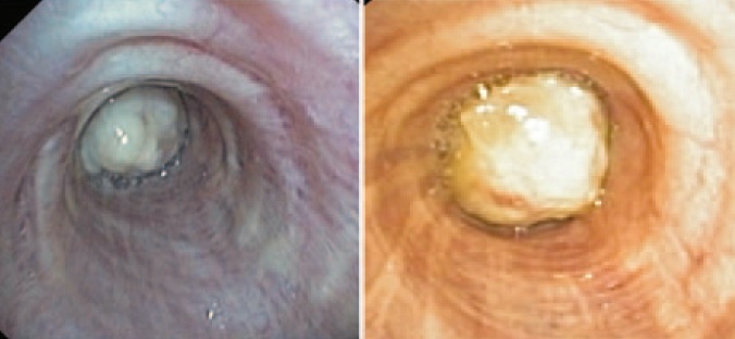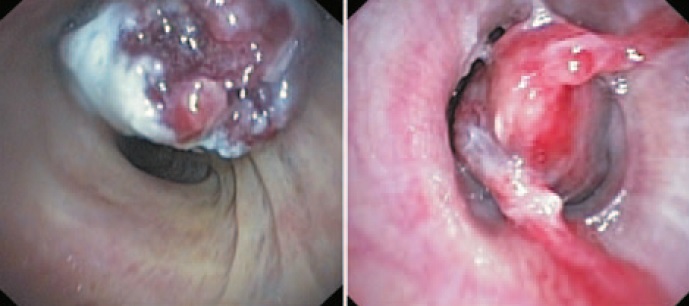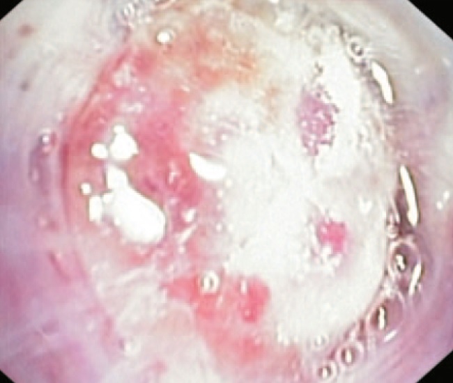 При метастазах рака толстой кишки в бронхи отмечалась полиповидная или округлая экзофитная опухоль розового цвета, с гладкой или неровной поверхностью, обтурирующая бронх, иногда с незначительным количеством некротического налета, без инфильтрации слизистой оболочки (рис. 3), реже отмечалась инфильтрация слизистой оболочки розового цвета с бугристыми разрастаниями (рис. 4).