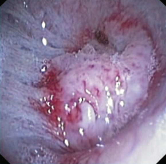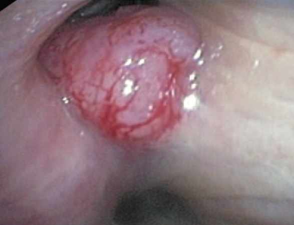 Метастазы синовиальной саркомы визуализировались в виде экзофитной опухоли серого цвета, с шероховатой поверхностью эластичной консистенции, легко кровоточащей при контакте, без инфильтрации слизистой оболочки (рис. 12).