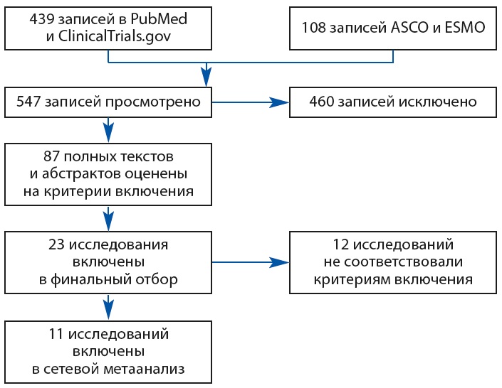 Схема отбора исследований для включения в сетевой метаанализ представлена на рис. 1.