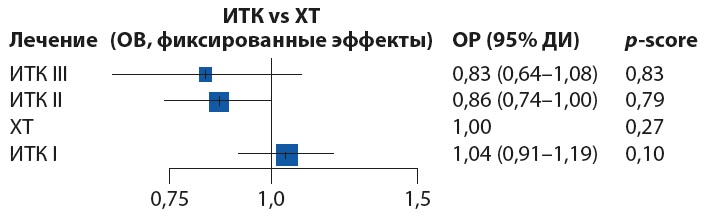 Рис. 3. Форест-график результатов сравнения эффективности применяемых в 1-й линии терапии пациентов с распространенным EGFR-ассоциированным НМРЛ ИТК в сравнении с ХТ с точки зрения ОВ, полученный при выполнении сетевого метаанализа.