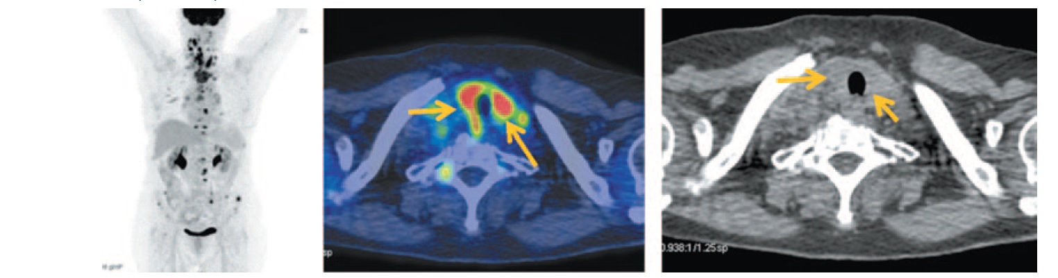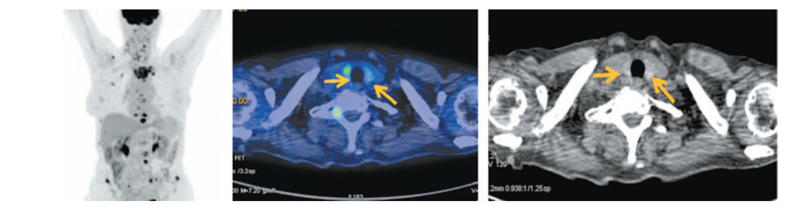 В последние годы количество сообщений о вторичном поражении щитовидной железы увеличилось благодаря внедрению новых диагностических опций, таких как ПЭТ, совмещенная с рентгеновской КТ [1, 16, 23].