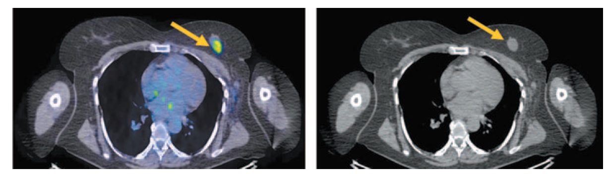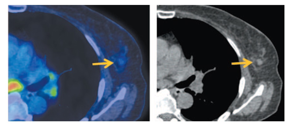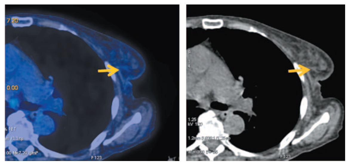 Рис. 2. Больная Б., 72 года, до лечения. На аксиальных ПЭТ/КТ проекциях в левой молочной железе в верхне-наружном квадранте на фоне неоднородно уплотненной железистой ткани определяется узловое образование диаметром до 11 мм с повышенной очаговой фиксацией ФДГ с SUVmax 1,33. Регионарные аксиллярные лимфоузлы слева единичные, с утолщенным кортикальным слоем размером до 17×8 мм, SUVmax 1,45. / Fig. 2. A 72-year-old woman before the treatment. Axial PET/CT images show the lump measuring <11 mm in diameter with the focal increased fludeoxyglucose (FDG) uptake SUVmax 1.33 in the upper outer quadrant of left breast against the background of heterogeneously scirrhous glandular tissue. Regional axillary lymph nodes on the left hand side are single, with cortical thickening measuring 17×8 mm, SUVmax 1.45.