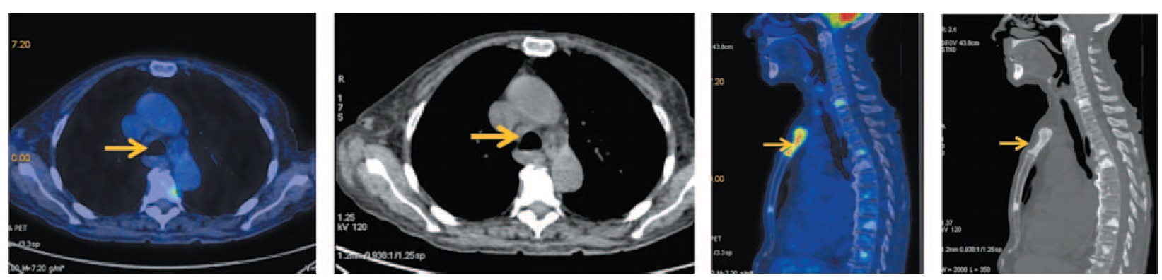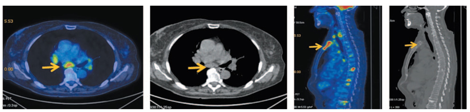 Рис. 3. Больная Б., 72 года, до лечения. На аксиальных и сагиттальных ПЭТ/КТ проекциях определяются множественные медиастинальные лимфоузлы (паратрахеальные верхней и нижней группы, бронхопульмональные с двух сторон, бифуркационные), размером до 15 мм с повышенной фиксацией ФДГ с SUVmax 5,0. Во всех костных структурах зоны сканирования на фоне смешанной перестройки костной ткани (преимущественно бластической, в грудине – литический характер) отмечается очаговый гиперметаболизм ФДГ SUVmax 7,65. / Fig. 3. A 72-year-old woman before the treatment. Axial and sagittal PET/CT images show multiple mediastinal lymph nodes (upper and lower paratracheal, bronchopulmonary on both sides, bifurcation groups of lymph nodes) measuring 15 mm with increased uptake of FDG SUVmax 5.0. In all bone structures of the scanning zone against the background of mixed bone remodeling (mostly blastic lesion, in the sternum – lytic metastatic lesion) with focal increased RFP uptake SUVmax 7.65.