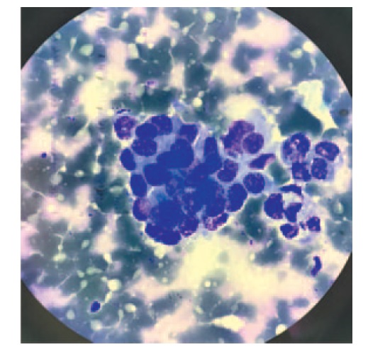 Рис. 8. Больная К., 55 лет. Пунктат опухоли щитовидной железы. Определяются железистоподобные и сосочкоподобные структуры из полиморфных и гиперхромных клеток рака, соответствующих протоковому раку молочной железы. Окрашивание по Романовскому. Ув. 1000. / Fig. 8. A 55-year-old woman. The aspiration of thyroid tumor. Gland-like and papillae-like structures from polymorphic and hyperchromic cell cancers corresponding to ductal carcinoma are detected Romanowsky stain, ×1000.