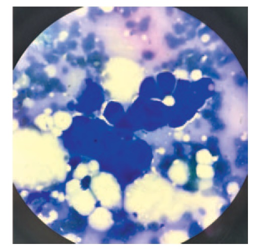 Рис. 7. Больная К., 55 лет. Пунктат опухоли молочной железы. Клеточный состав обильный, представлен многочисленными папиллярными, железистоподобными структурами опухолевых клеток протокового рака. В ядрах просматриваются увеличенные ядрышки. Окрашивание по Романовскому. Ув. 1000. / Fig. 7. A 55-year-old woman. The aspiration of breast tumor. The cell elements are abundant and represented by numerous papillae-like, gland-like structures of tumor cells of ductal carcinoma. The nuclei have enlarged nucleoli. Romanowsky stain, ×1000.