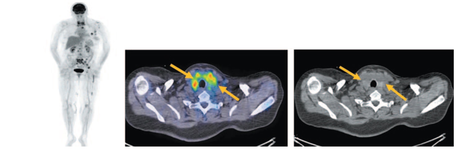 Рис. 1. Больная Б., 72 года, до лечения. На MIP и аксиальных ПЭТ/КТ проекциях отмечается диффузное умеренное увеличение размеров щитовидной железы: правой доли до 10×21 мм, левой доли до 13×22 мм с повышенной фиксацией РФП, SUVmax 10,90. Структура ее в условиях нативного сканирования однородная. Определяются лимфатические узлы с двух сторон размером до 8 мм SUVmax 5,48; IIa, IIb группы справа и III, IV групп с двух сторон размером до 13 мм с повышенной фиксацией РФП, SUVmax 12,93. / Fig. 1. A 72-year-old woman before the treatment. MIP and axial positron emission tomography/computed tomography (PET/CT) images show moderate diffuse enlargement of the thyroid gland: the right lobe of the thyroid gland is 10×21 mm, the left lobe of the thyroid gland is 13´22 mm with increased uptake of radiopharmaceutical, SUVmax 10.90. The structure of the thyroid gland during native computed tomography images was homogeneous. The images showed lymph nodes on both sides measuring 8 mm SUVmax 5.48; IIa, IIb groups on the right side and III, IV groups on both sides measuring 13 mm with increased uptake of radiopharmaceutical (RFP), SUVmax 12.93.