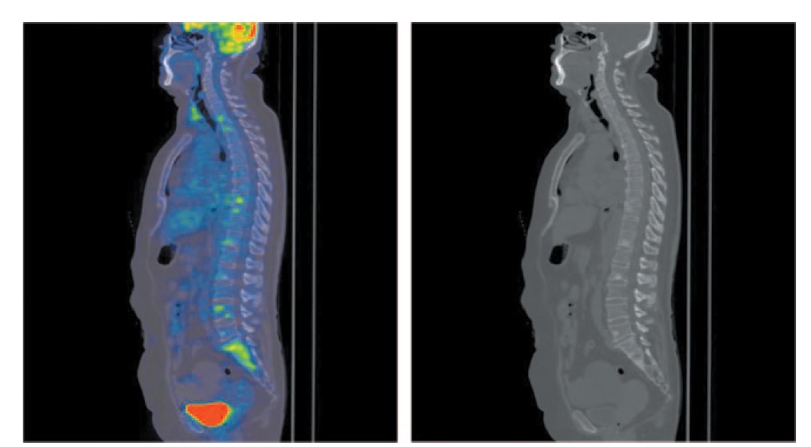 Рис. 11. Больная К., 55 лет. На сагиттальных ПЭТ/КТ проекциях в костях скелета определяются множественные очаги повышенной фиксации РФП на фоне остеобластической перестройки костной ткани, SUVmax 4,86.