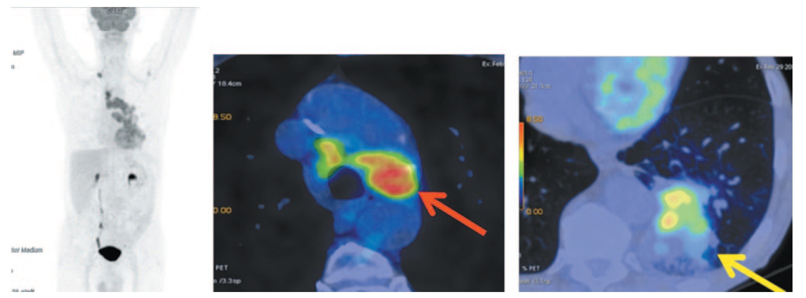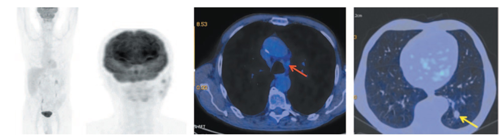 Рис. 3. Больной П., 76 лет, после 10 введений атезолизумаба (через 6 мес от начала лечения). На МIP- и аксиальных ПЭТ/КТ-проекциях надключичный лимфоузел справа не визуализируется. В нижней доле левого легкого на месте патологического образования определяется тяж фиброза с узловым образованием (желтая стрелка) в структуре размером до 13×14 мм (ранее 15×16 мм) без метаболической активности ФДГ. Отмечается регресс цепочки паратрахеальных лимфоузлов с верхнего уровня до бифуркации. Лимфоузлы аортопульмонального окна размером до 10×12 мм (красная стрелка). / Fig. 3. A 76-year-old patient P. after 10 injections of atezolizumab (6 months after the start of treatment). MIP and axial PET/CT images did not show the right supraclavicular lymph. In the lower lobe of the left lung at the site of the pathological lesion, a band of fibrous tissue with a nodular formation (yellow arrow) is determined in a structure measuring 13×14 mm (previously 15×16 mm) without FDG metabolic activity. There is a regression of the paratracheal lymph nodes from the upper level to the bifurcation. Aortopulmonary window lymph nodes are measuring 10×12 mm (red arrow).