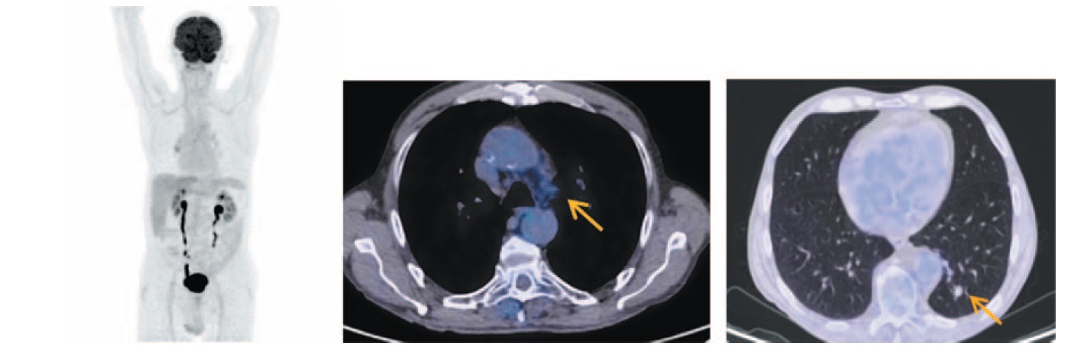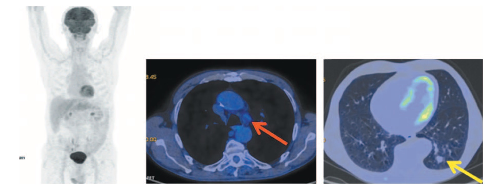 Рис. 4. Больной П., 76 лет, после 16 введений атезолизумаба (через 10 мес от начала лечения). На МIP- и аксиальных ПЭТ/КТ-проекциях в нижней доле левого легкого сохраняется тяж фиброза с узловым образованием в структуре размером до 12×10 мм без метаболической активности ФДГ. Сохраняются лимфоузлы аортопульмонального окна размером до 10 мм с фоновой фиксацией РФП. / Fig. 4. A 76-year-old patient P. after 16 injections of atezolizumab (10 months after the beginning of treatment). A band of fibrous tissue with a nodular formation in a structure measuring 12×10 mm without FDG metabolic activity in the lower lobe of the left lung is still detected on MIP- and axial PET/CT images. Aortopulmonary window lymph nodes measuring 10 mm with focal RFP uptake are still detected.
