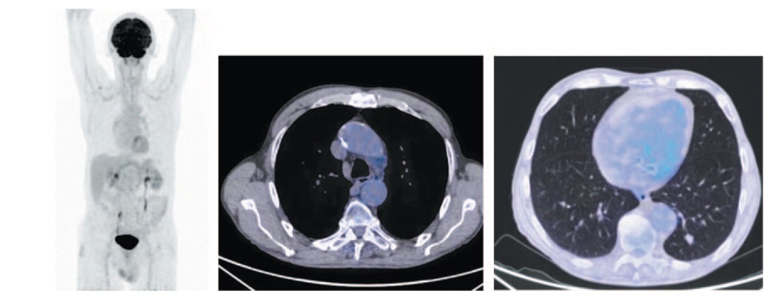 После 10-го введения атезолизумаба (через 7 мес от начала лечения) произведено ПЭТ/КТ-исследование. Объем нижней доли левого легкого восстановлен. На месте патологического образования отмечается фиброзный тяж без метаболической активности ФДГ. Надключичный лимфатический узел справа не определяется. В плевральных полостях и полости перикарда экссудата нет. Лимфоузлы средостения не выявлены (рис. 3). Отмечается полная регрессия опухоли по критериям RECIST v.1.1. и полный морфо-метаболический ответ по результатам ПЭТ/КТ.