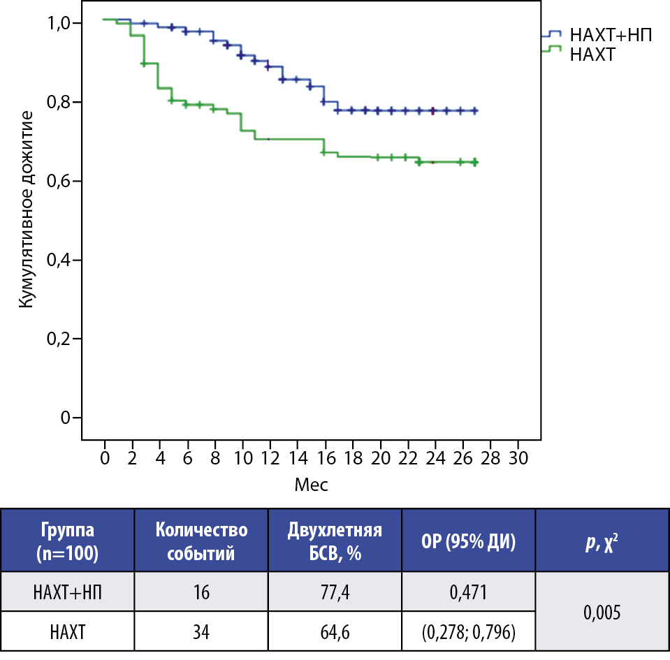 В группе НАХТ+НП 2-летняя БСВ составила 77,4% против 64,4% в группе исторического контроля НАХТ: относительный риск – ОР 0,471 (95% доверительный интервал – ДИ 0,278–0,796; p=0,005); рис. 1.