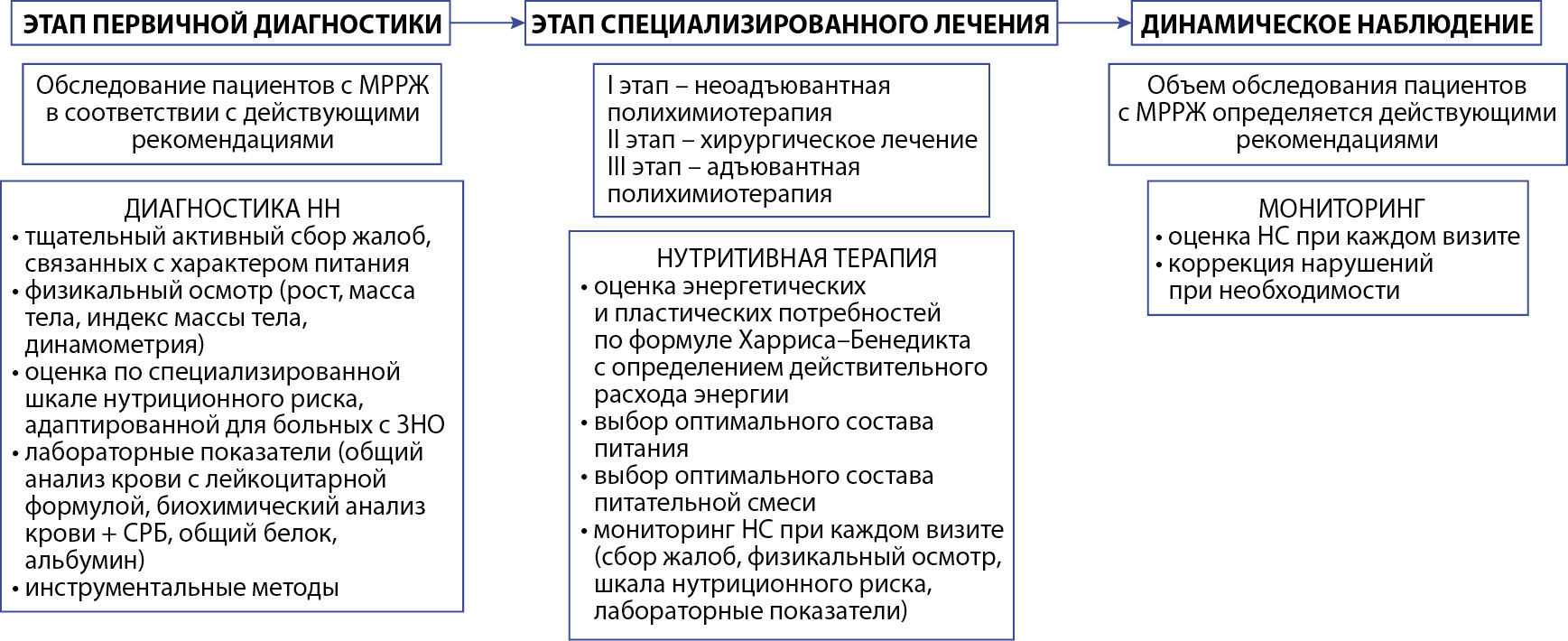 Рис. 3. Оптимальный алгоритм оценки НС и реализации нутритивной терапии у пациентов с МРРЖ, используемый в ФГБУ «НМИЦ онкологии им. Н.Н. Петрова».