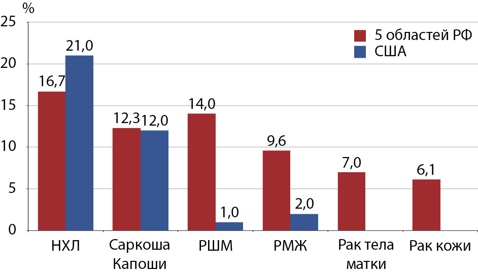 Распространенность онкологической патологии и ее характер среди ВИЧ-инфицированных людей в РФ изучены недостаточно. Единичные исследования свидетельствуют о существенном увеличении числа регистрируемых случаев онкологической патологии [4, 11, 12], наиболее частом выявлении НХЛ и лимфомы Ходжкина, рака легких и плоскоклеточного рака различной локализации у пациентов с продвинутыми стадиями ВИЧ-инфекции [13–16].