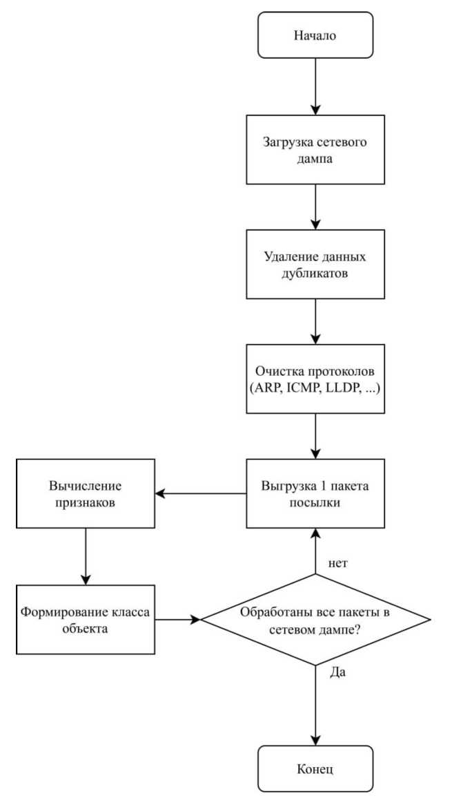 Повышение точности классификации сетевых приложений напрямую зависит от правильного выделения характерных особенностей их поведения. Необходимо сформировать набор признаков, точно описывающих сетевую активность приложений. Данный процесс можно представить в виде алгоритма (рис. 4).