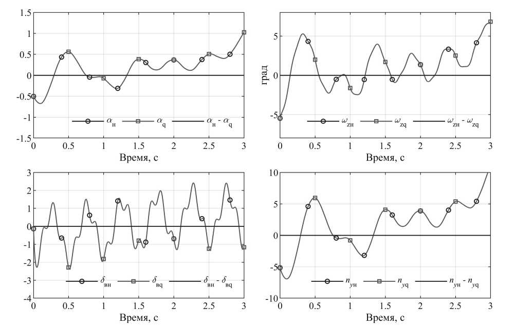 Согласно результатам, полученное разложение (14) по форме (6) обеспечивает высокую точность аппроксимации исходных функций (13). Проведем сравнительный анализ путем численного моделирования исходной нелинейной модели (1) и ее qLPV формы (8). В качестве условий моделирования выбран фиксированный режим с высотой полета H = 23 км и числом Маха M = 5. Соотношения параметров объекта для такого режима представлены в табл. 3.