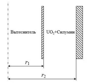 Оценка времени плавления силуминовой матрицы. В качестве времени плавления силумина принималась величина его тепловой инерционности, исходя из соотношения τ = γсr2/λ, где в числителе – плотность, теплоемкость и квадрат характерного размера материала соответственно, а в знаменателе – теплопроводность. Твэл моделируемой РУ представлялся в виде цилиндрического стержня с соосно ему расположенным цилиндрическим вытеснителем (рис. 1). ТК занимает объем между вытеснителем и оболочкой твэла.