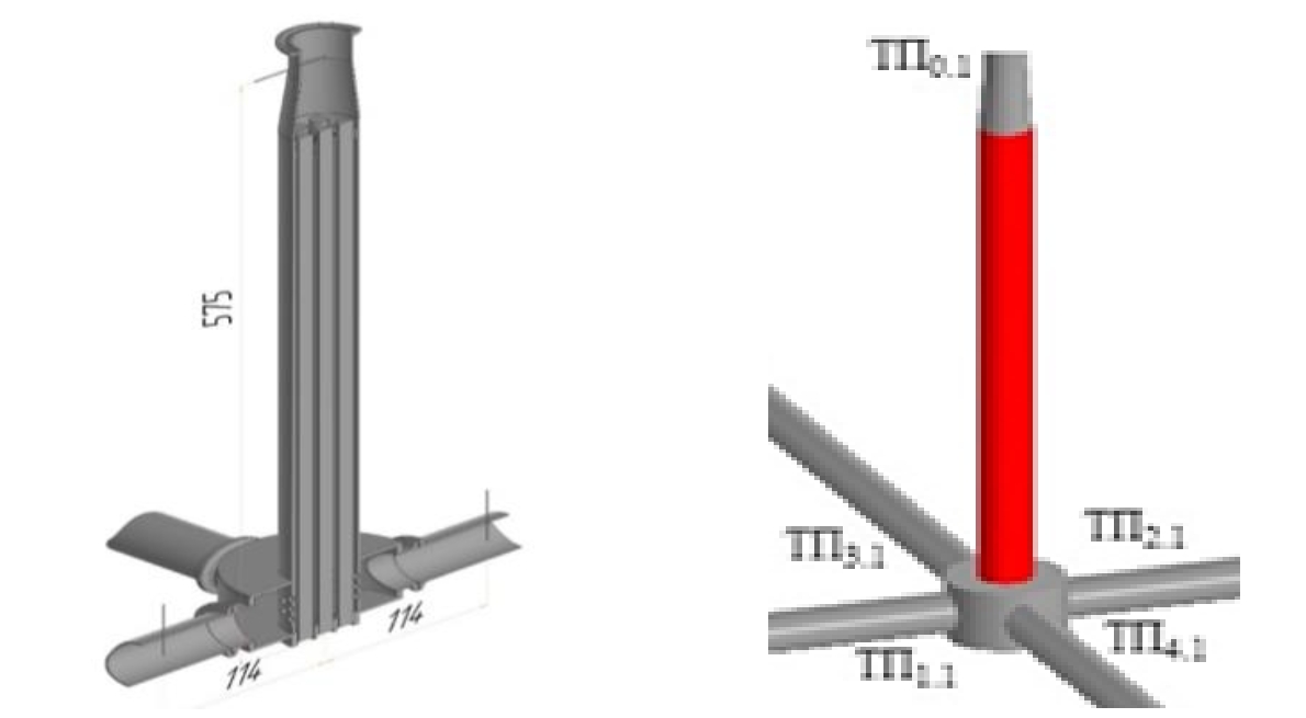 В нижней части восходящей линии стенда присутствует источник тепла в виде модели ТВС. Модель ТВС состоит из семи вертикальных стержней, имитирующих тепловыделяющие элементы (номинальной мощностью 2 кВт, линейной мощностью 4,35 кВт/м), расположенных в шестигранной решетке с относительным шагом 1,4 между центрами стержней.