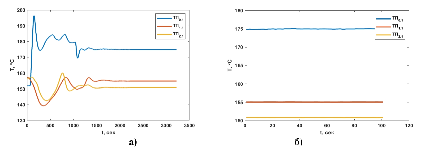 Рис. 3. Изменение температуры теплоносителя на выходе и входе в модель ТВС при использовании двух циркуляционных петель: а) включение источника тепловыделения и выход на стационарное состояние; б) изменение температуры при стационарном режиме ЕЦ. Подводимая мощность 1,8 кВт
