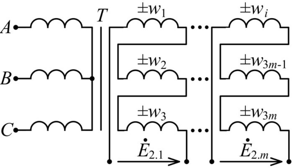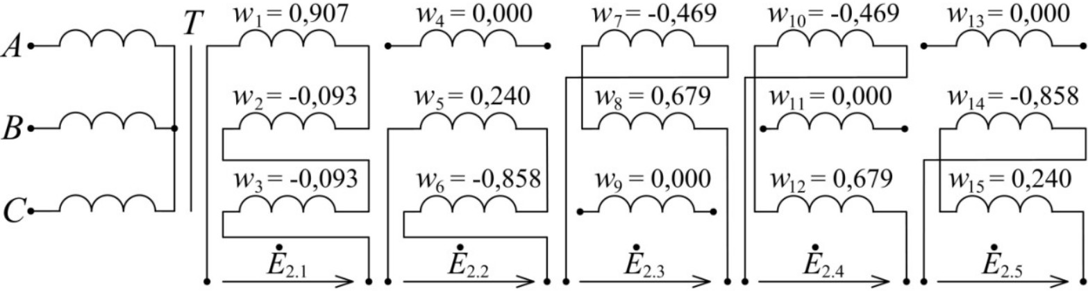 Геометрическая сумма ЭДС катушек позволяет получить любую необходимую начальную фазу вектора ЭДС фазной обмотки. Для того чтобы обеспечить многофазную симметричную систему ЭДС на выводах вторичной обмотки ТПФ, нужно определить число витков катушек каждой фазы (Wi), при этом суммарная мощность симметричной многофазной нагрузки должна быть равномерно распределена между катушками, размещенными на трех разных стержнях сердечника, чтобы нагрузка трехфазной сети была симметричной.