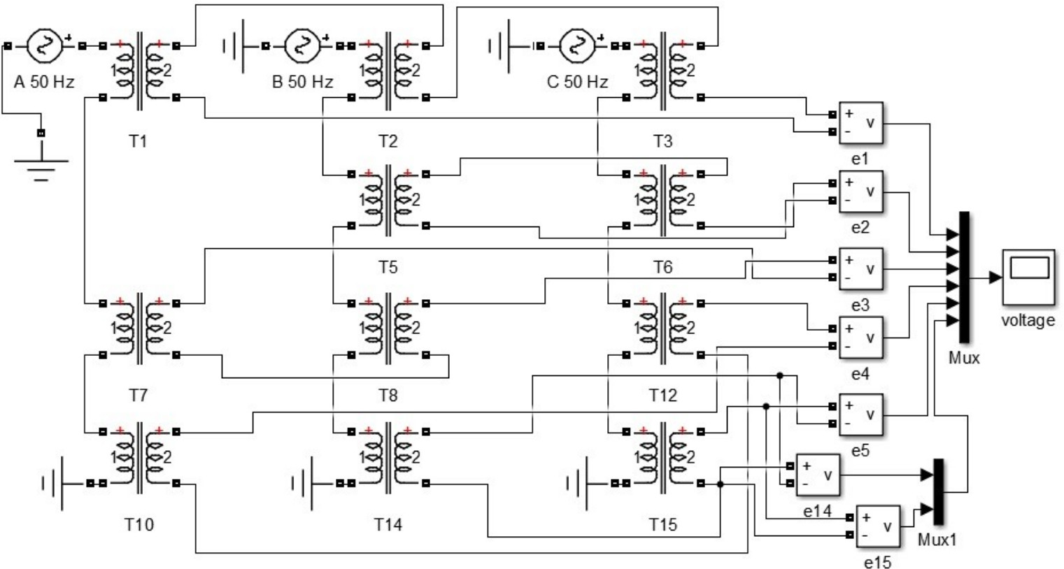Моделирование преобразователя с заданной схемой соединения обмоток (см. рис. 2) выполнено в программе Matlab Simulink. Схема соединения обмоток трехфазно-пятифазного ТПФ реализована с использованием однофазных трансформаторов, у которых заданы различные коэффициенты трансформации (рис. 3).