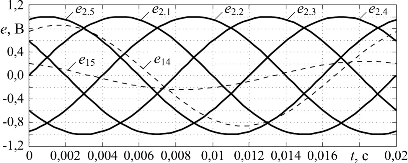 На рис. 4 также приведены временные диаграммы ЭДС катушек e14 и e15, обеспечивающие создание ЭДС пятой фазы вторичной обмотки e2.5.