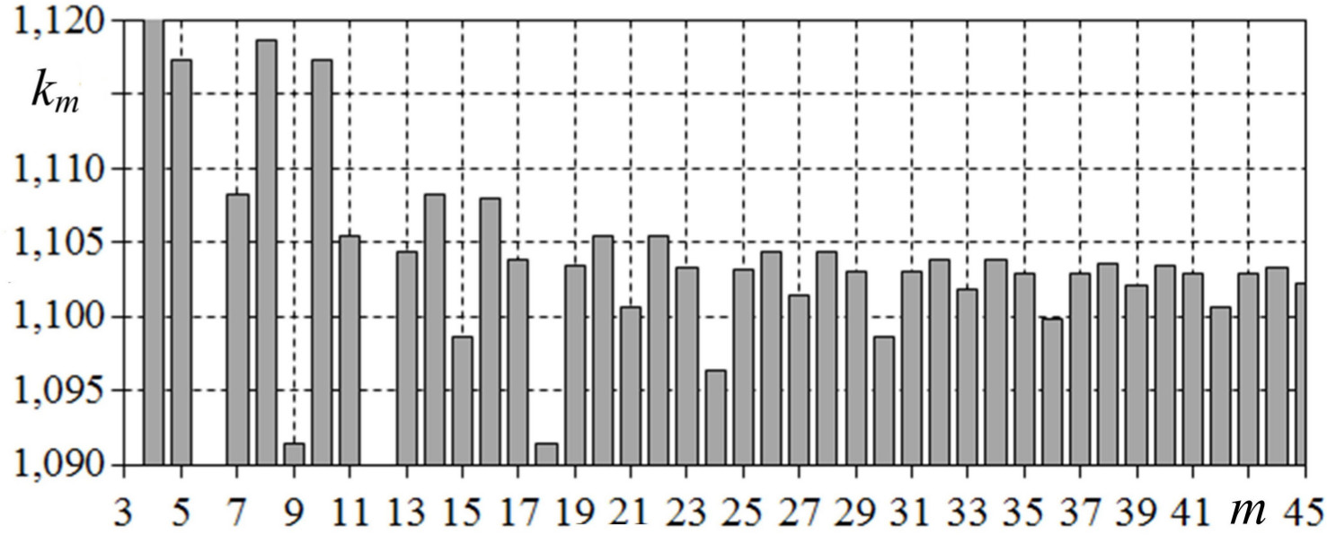 Коэффициент km рассчитан для числа фаз в диапазоне от 3 до 300, значения для приведены на рис. 5, при наибольшее значение коэффициента составило 1,106 ( и 193), наименьшее – 1,1.