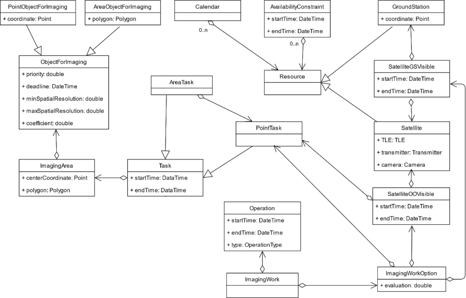 Для каждой задачи на съемку точечного объекта формируются варианты размещения (ShootingWorkOption), которые представляют собой сочетание видимости МКА-ОН (SatelliteOSVisible) и видимости КА-НС (SatelliteGSVisible), а также значение ЦФ (1). В процессе планирования для задачи выбирается один из вариантов размещения, на базе которого создается работа по съемке (ShootingWork). Работа по съемке состоит из трех операций (Operation): съемка, сброс и прием данных. Для хранения всех запланированных работ по съемке используется расписание (Schedule).