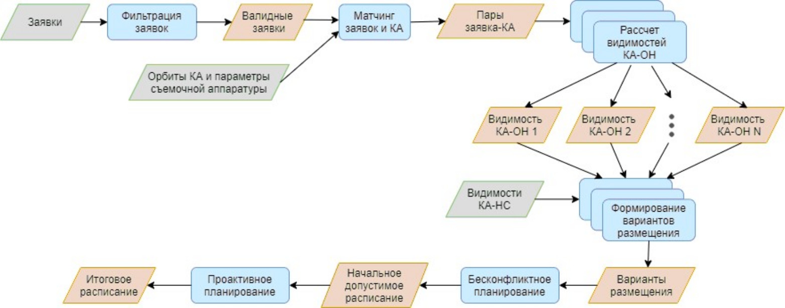 Рис. 3. Схема процесса планирования заявок на съемку в системе. Входные данные выделены зеленым цветом, методы обработки – синим, выходные данные – оранжевым