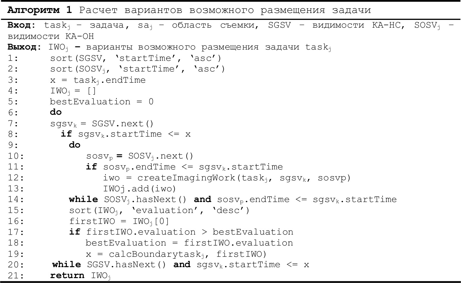 Рассмотрим подробнее работу данного метода. На вход метода поступает задача taskj, для которой необходимо осуществить расчет вариантов возможного размещения, и область съемки saj, соответствующая данной задаче, а также предварительно рассчитанные видимости МКА-ОН SOSVj и МКА-НС SGSV. В начале работы метода выполняется сортировка видимостей МКА-ОН SOSVj и МКА-НС SGSV по возрастанию времени начала соответствующего интервала (строки 1–2). Граничное время для сброса результатов съемки x принимается равным времени окончания планирования задачи taskj.endTime (строка 3). Далее выполняется последовательный перебор видимостей МКА-НС SGSV до тех пор, пока время начала очередной видимости sgsvk.startTime не превысит текущее граничное значение времени x (строки 6–20). На каждой итерации выполняется комбинация видимости МКА-НС sgsvk и предшествующих ей видимостей МКА-ОН SOSVj с последующим формированием на основе пары sgsvk и sosvp варианта размещения iwo (строки 9–14). В конце каждой итерации выполняется проверка, не превышает ли оценка новых найденных вариантов текущую лучшую оценку bestEvaluation (строка 17). Если это утверждение истинно, выполняется пересчет граничного времени для сброса результатов съемки х, а bestEvaluation принимает новое лучшее значение (строки 18–19). В ходе работы метода выстраивается последовательность вариантов возможного размещения задачи , в начале которой стоит вариант размещения, расположенный в точке глобального оптимума ЦФ задачи OFk (1).