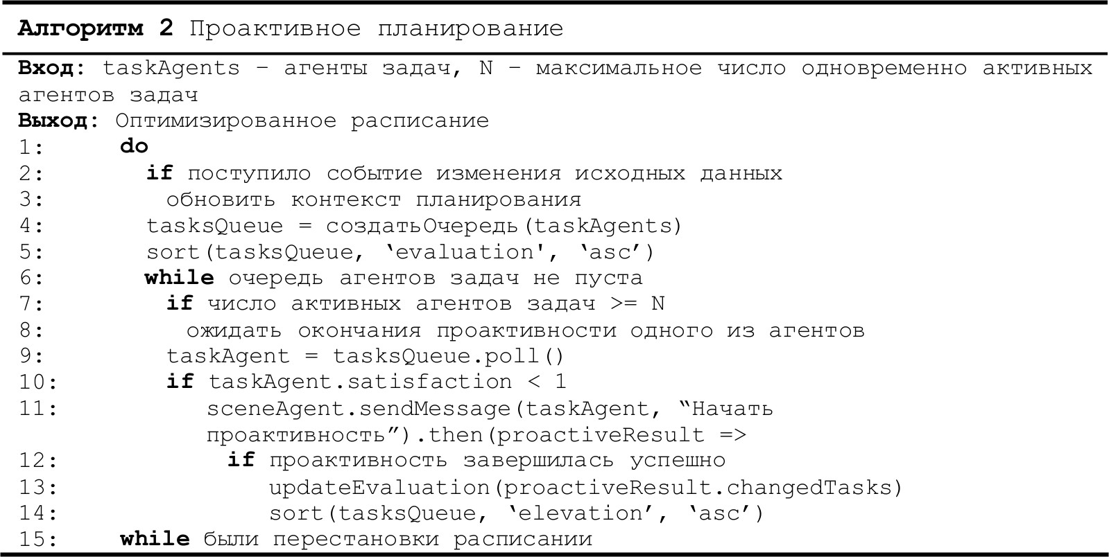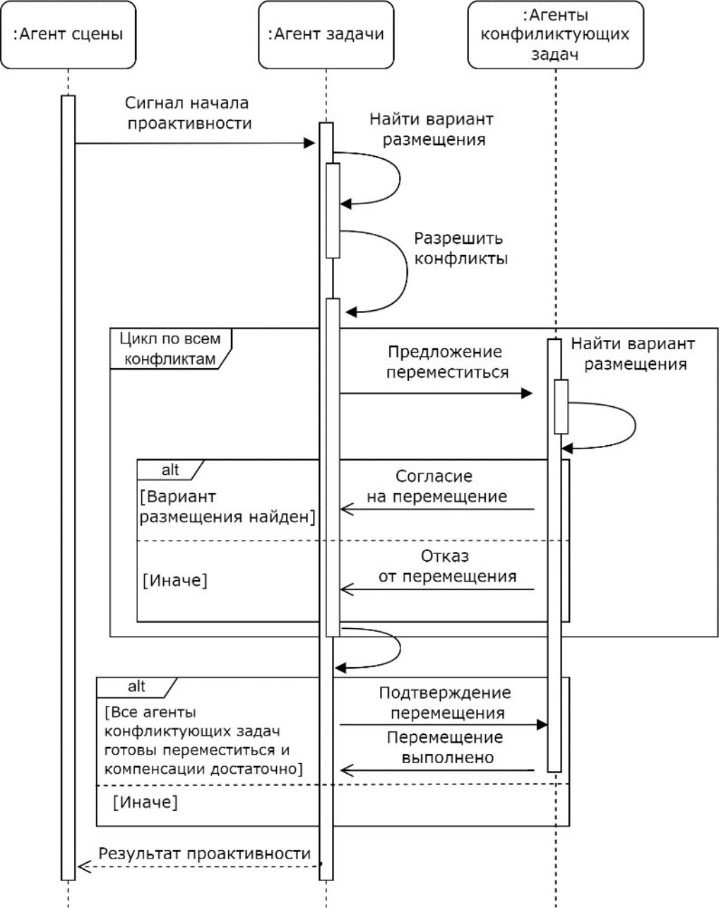 На этапе проактивного планирования полученное расписание оптимизируется с использованием мультиагентного подхода, который заключается в конкуренции и кооперации программных агентов, обладающих определенными возможностями или потребностями [4]. Программные агенты взаимодействуют посредством переговоров, в ходе которых путем взаимных компромиссов и уступок приходят к локально-оптимальному решению задачи.
