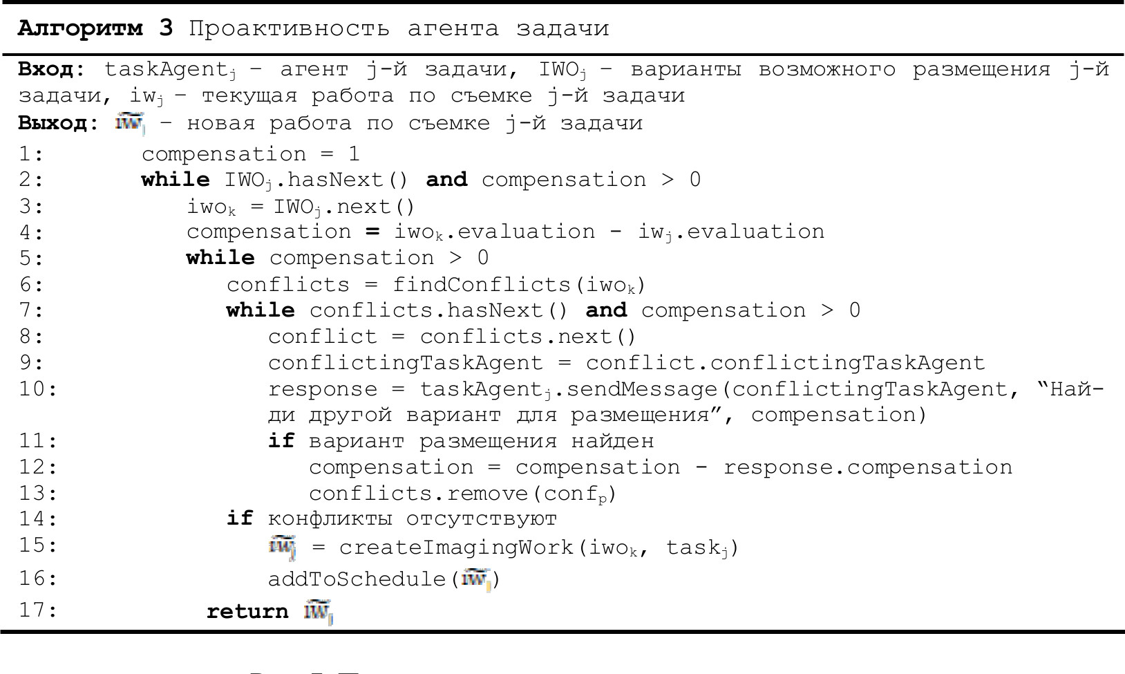 Кроме того, существует ряд работ, описывающих применение агентных подходов к решению задачи планирования ДЗЗ [26–28]. Процесс планирования, предложенный в работе [26], заключается во взаимодействии агентов полосы съемки и агентов КА и основывается на эвристиках из программирования в ограничениях. Приведенные авторами результаты сравнения с жадным алгоритмом, применяемым в настоящее время, показывают преимущества предлагаемого подхода. Однако производительность предлагаемого решения все еще остается недостаточной применительно к поставленной задаче. В работе [27] для распределения заказов на съемку ОН между спутниками в группировке рассматриваются механизмы рыночных аукционов. В рассматриваемой постановке задачи каждый спутник управляется отдельным центром миссии. Центры миссий координируют свое расписание, используя протоколы аукционов и предлагая цену за свободные заказы в зависимости от влияния на бортовой план и предполагаемую прибыль. В работе [28] затрагивается идея полностью автономного планирования на борту КА. Основные преимущества данного подхода предопределяются возможностями использования текущих фактических данных о состоянии КА и его ресурсов и возможностями реагирования на возникающие события в режиме реального времени. Однако, как отмечают авторы работы, с точки зрения практического реализации для создания полноценной мультиагентной системы из КА на орбите необходимо решить еще большое количество проблем, таких, например, как преодоление ограничений вычислительных возможностей бортовой аппаратуры КА, а также построение устойчивой коммуникационной системы из нескольких КА.