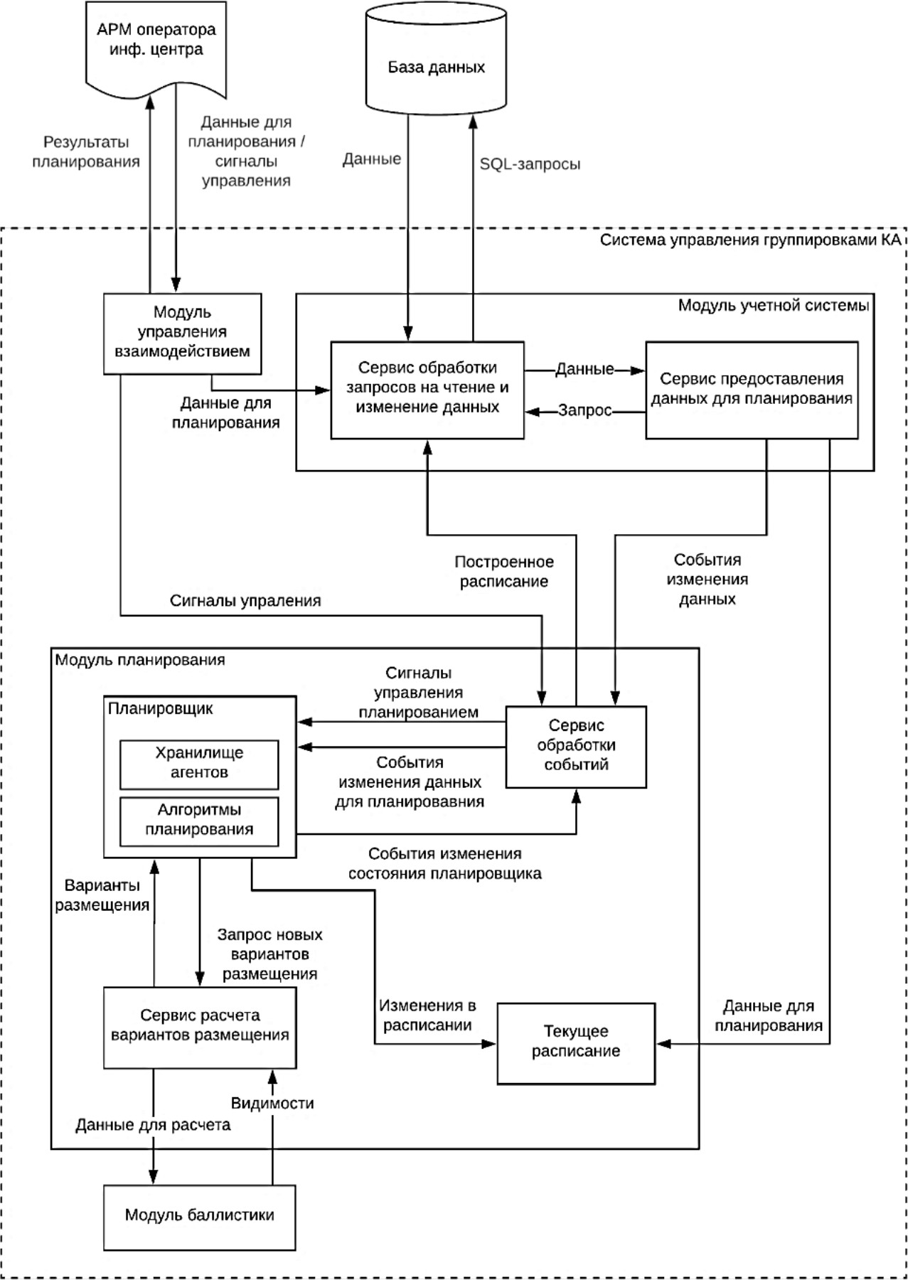 Модуль учетной системы предназначен для взаимодействия других частей системы с сервером базы данных. Включает в свой состав сервис обработки запросов на чтение и изменение данных, целью которого является осуществление запросов к реляционной БД посредством ORM (Object-Relational Mapping), а также сервис предоставления данных планировщику, предназначенный для преобразования и предоставления данных, хранимых в БД, в формат данных, понятный планировщику. Кроме того, сервис предоставления данных планировщику отслеживает изменения в исходных данных по запросу модуля планирования.