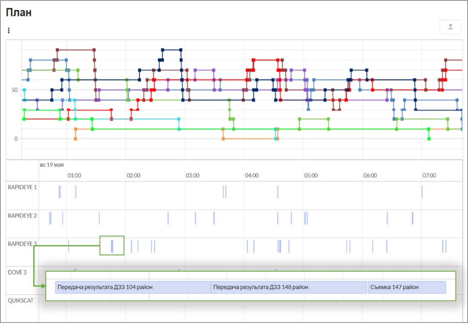 На рис. 10 представлен экран с результатами планирования операций для каждого МКА и НС, отображаемыми на временной шкале. В верхней части экрана расположен график заполнения запоминающих устройств КА, демонстрирующий ограничения по памяти.