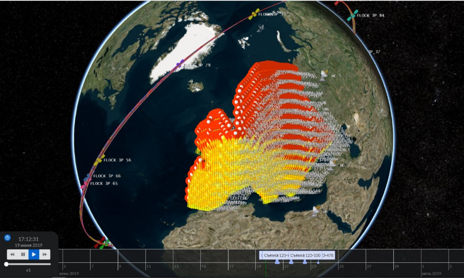 На рис. 11 представлен экран с физической моделью мира, в котором функционирует КС: трехмерная модель Земли, орбиты МКА, расположение ОН и НС. При этом моделируются процессы проведения съемки и передачи ее результатов. В нижней части экрана находится временная шкала, на которой отображается очередь ближайших запланированных операций, и виджет управления модельным временем.