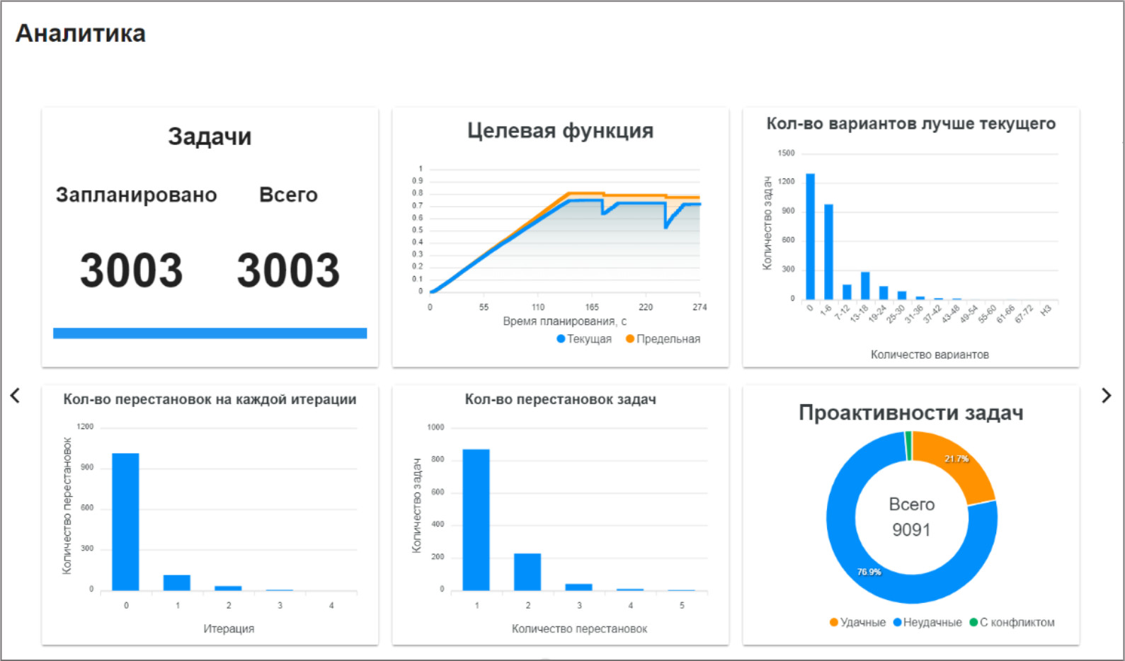 – столбчатую диаграмму распределения общего числа перестановок задачи в ходе планирования, позволяющую проанализировать, насколько активно менялось расписание в ходе планирования;
