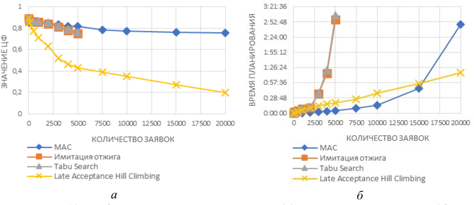 Рис. 13. Графики зависимости значения ЦФ (а) и времени планирования (б) от количества заявок