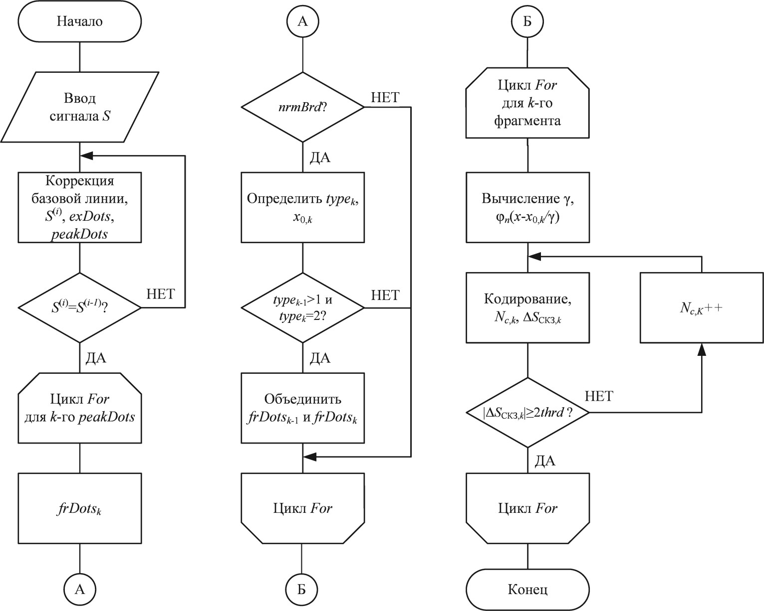 С учетом описанных масштабных коэффициентов был разработан алгоритм аппроксимации сигналов в базисе функций Чебышева – Эрмита (рис. 1). Помимо вычисления коэффициентов масштаба и сдвига в ходе данного алгоритма происходит деление сигнала на фрагменты, что снижает погрешность аппроксимации [24].