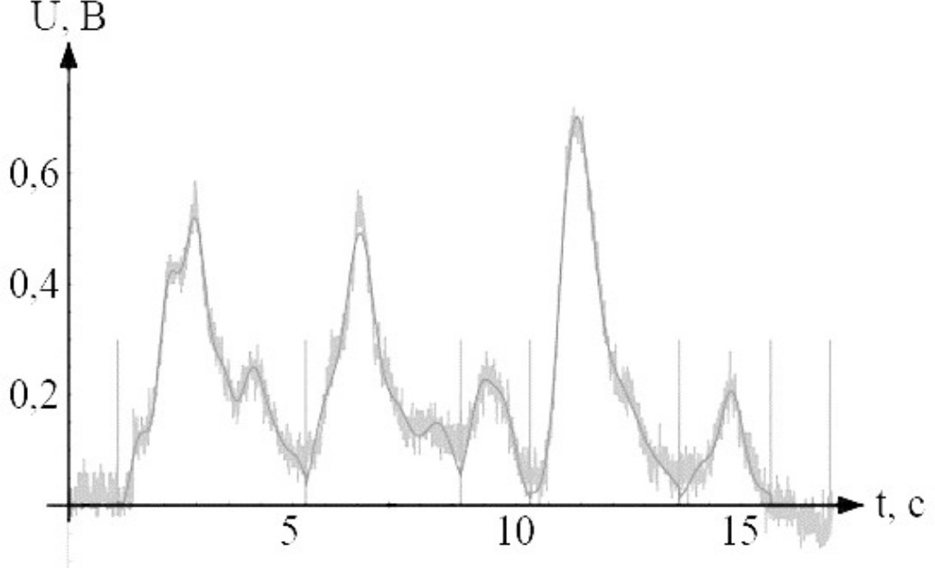Аппроксимация сигналов в базисе функций Чебышева – Эрмита обладает сглаживающими свойствами, что позволяет устранять случайную помеху. На рис. 2 представлен пример сглаживания реального хроматографического сигнала c предварительным его делением на фрагменты по алгоритму рис. 1. Начальный и конечный фрагменты классифицируются как шум, поэтому на рис. 2 данные области обнулены.
