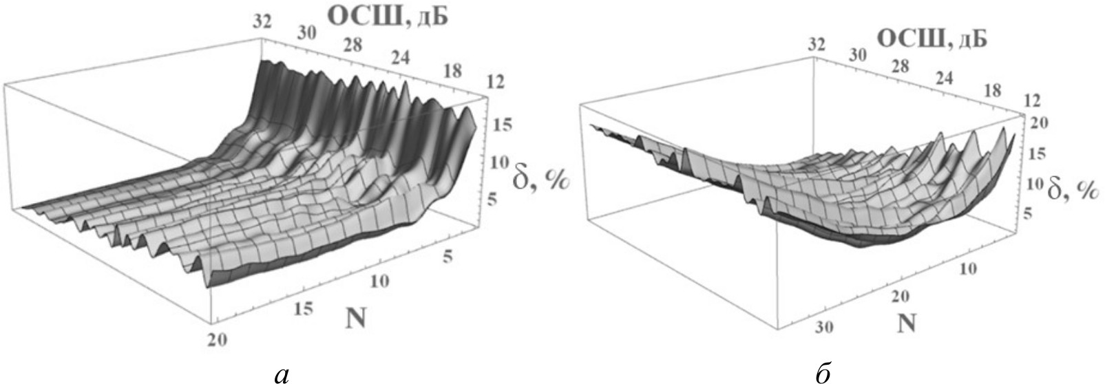 На рис. 2 данное сравнение представлено в виде графиков, где а – сглаживание с применением цифрового фильтра N порядка, б – путем восстановления сигнала по коэффициентам кодирования N порядка (максимальный порядок функции) в базисе функций Чебышева – Эрмита.
