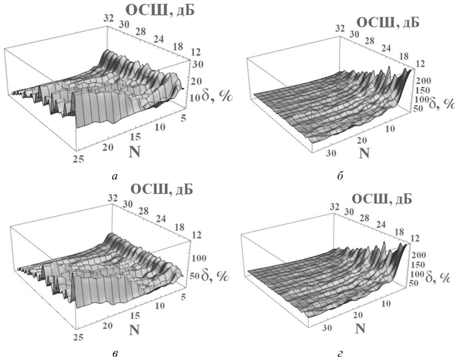 Поскольку помимо самих сигналов сглаживание требуется (и в большей степени) при вычислении их производных, для того же S была оценена погрешность вычисления производных первого и второго порядка относительно численно определенной производной [26] по сглаженному цифровым фильтром сигналу. Для оценки погрешности использовалось выражение (12) с заменой сигнала на его производную (как в случае исходного, так и в случае сглаженного сигнала). Результаты представлены на рис. 4, где а и в – соответственно первая и вторая производные, полученные численно по сглаженному цифровому сигналу, б и г – восстановленные по базису (7) сглаженные производные.