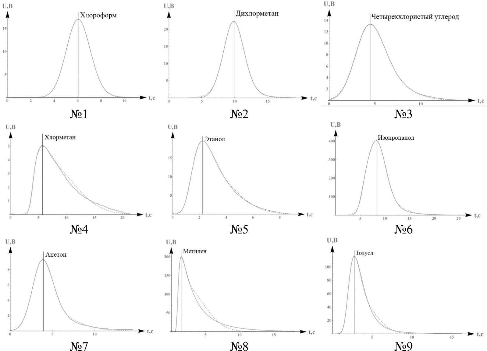 Из полученных хроматограмм были извлечены 9 наиболее характерных пиков, конфигурация которых наиболее часто встречается в реальных хроматограммах (рис. 6). Многие пики на практике близки по форме к гауссиане, но с небольшой разницей в крутизне фронтов; при выборе пиков для обработки были собраны наиболее часто встречаемые асимметричные конфигурации, которые, как правило, являются одиночными. Для оценки зависимости погрешности отличия пика от симметричной гауссианы (как наиболее простой для обработки модели) был использован метод моментов, на основе которого вычислялись коэффициенты асимметрии и эксцесса [27]: