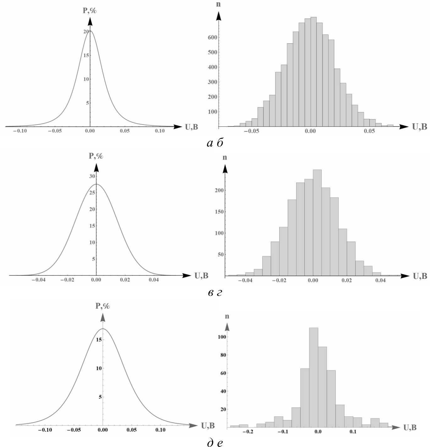 Рис. 7. Гистограммы распределения помехи: а, б – для пика № 8, распределение Коши; в, г – для остатка хроматограммы, нормальное распределение; д, е – для пика № 9, логистическое распределение