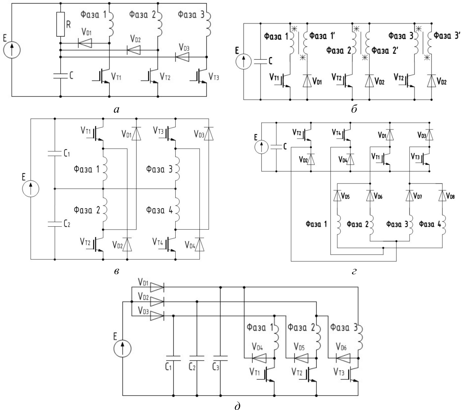 Рис. 1. Схемы одноключевых преобразователей (q ключей на q фаз): а – схема преобразователя ВИП с подавляющим резистором в 3-фазном исполнении; б – схема преобразователя ВИП с бифилярной обмоткой в 3-фазном исполнении; в – схема преобразователя ВИП с разделенным звеном постоянного тока в 4-фазном исполнении; г – схема преобразователя с одним полупроводниковым ключом, двумя диодами и со смежной работой фаз в 4‑фазном исполнении; д – схема преобразователя с одним полупроводниковым ключом, двумя диодами и независимой работой фаз в 3-фазном исполнении