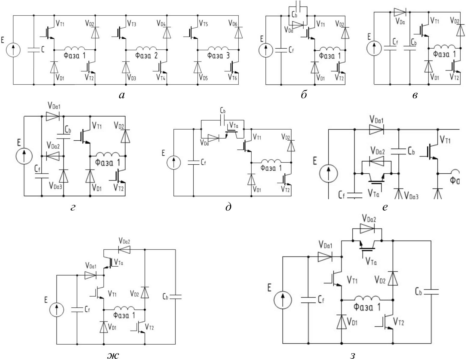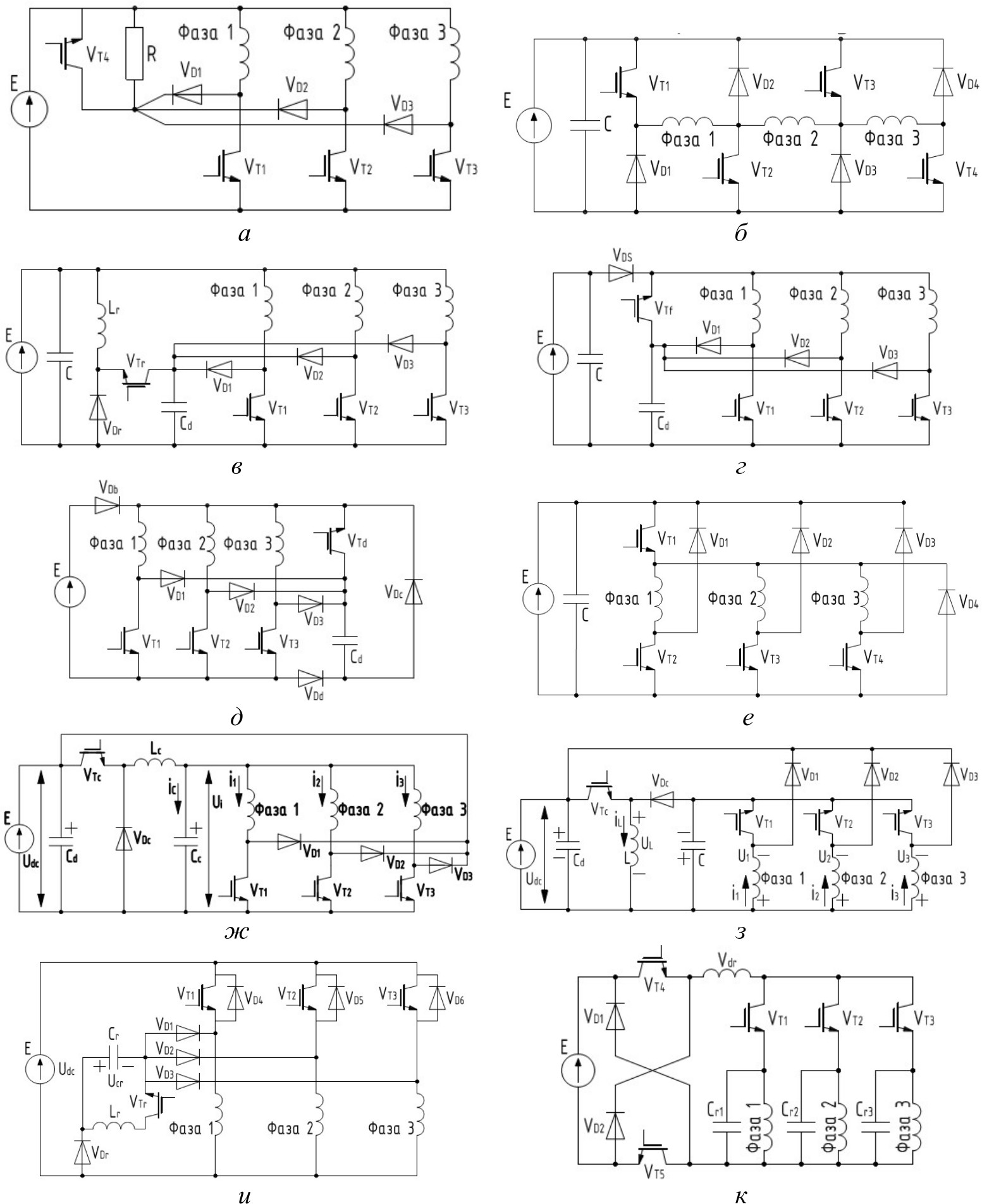 Рис. 2. Схемы преобразователей с (q + 1) ключами на q фаз: а – схема преобразователя с двойным размагничиванием в 3-фазном исполнении; б – схема преобразователя с общим ключом на 2 фазы в 3-фазном исполнении; в – схема преобразователя с накопительным конденсатором в 3-фазном исполнении; г – схема модифицированного преобразователя с накопительным конденсатором в 3-фазном исполнении; д – схема энергоэффективного преобразователя с накопительным конденсатором в 3-фазном исполнении; е – схема преобразователя Миллера в 3-фазном исполнении; ж – схема преобразователя c минимальным количеством ключей и повышенным входным напряжением в 3-фазном исполнении; з – схема преобразователя c минимальным количеством ключей и повышенным импульсным входным напряжением в 3-фазном исполнении; и – схема резонансного преобразователя с накопительным конденсатором в 3-фазном исполнении; к – резонансный преобразователь в 3-фазном исполнении